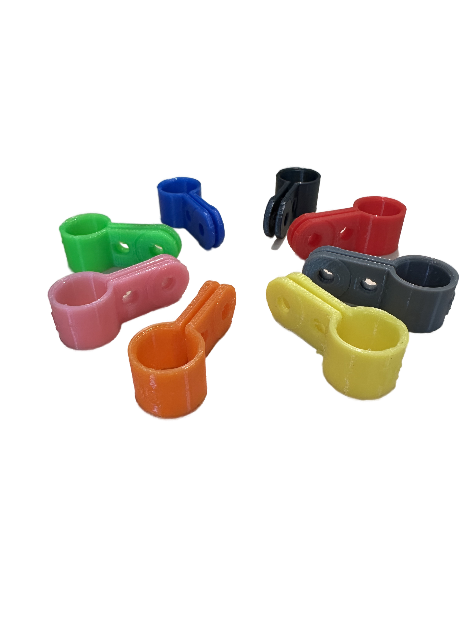 Bague d'attache souple conçus a l'aide de l'impression 3D , la bague est faites de plastique souple le clips lui est fais de plastique rigide .